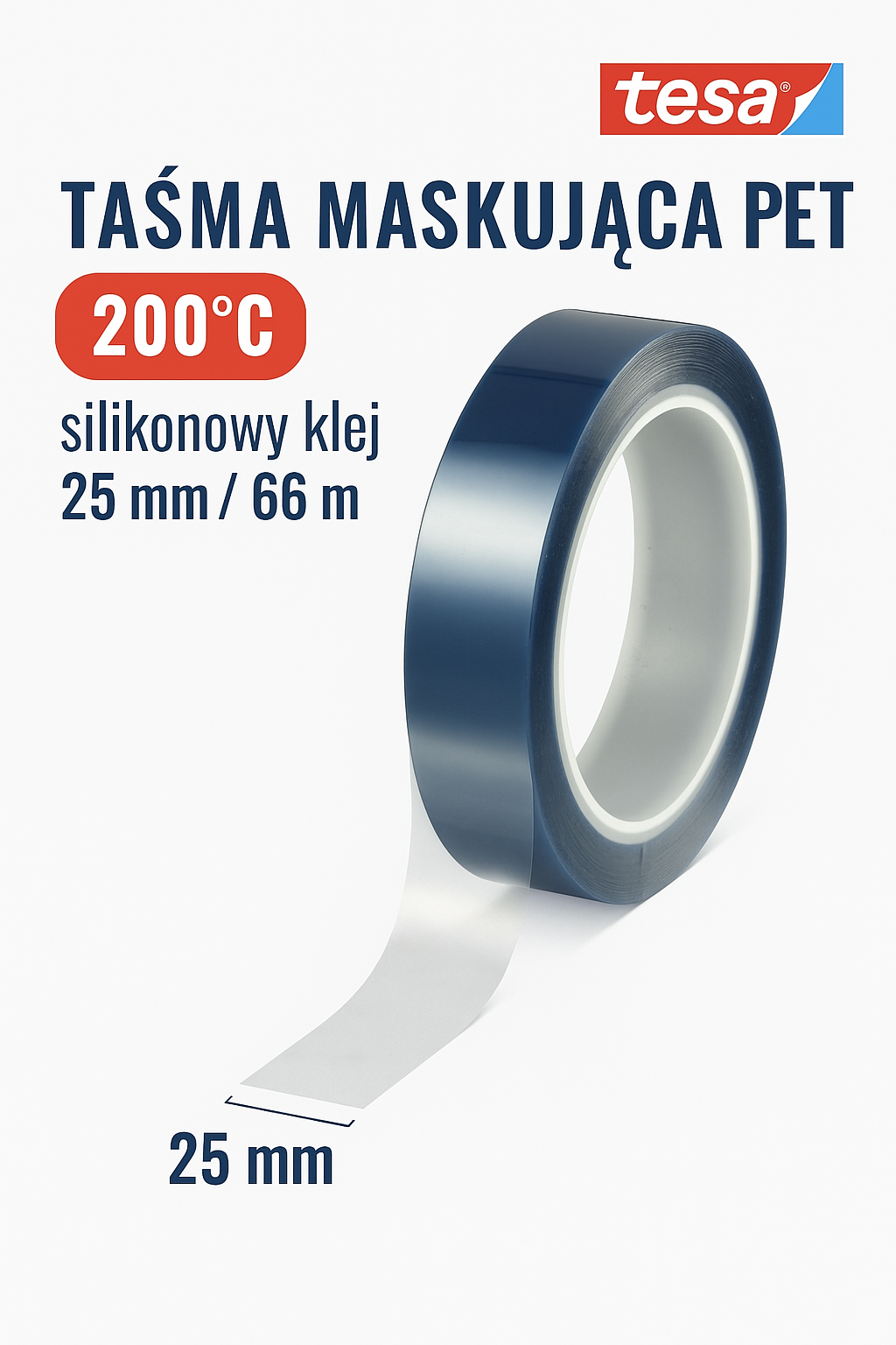 Taśma TESA 50625 to profesjonalna taśma maskująca PET z silikonową substancją klejącą, stworzona do pracy w wysokich temperaturach — nawet do 200°C przez 30 minut. Dzięki niezawodnemu nośnikowi z poliestru oraz precyzyjnemu systemowi klejenia, taśma doskonale dopasowuje się do powierzchni i usuwa się bez pozostawiania śladów. Idealna zarówno do malowania proszkowego, jak i do innych zastosowań wymagających dokładnego maskowania i ochrony powierzchni.