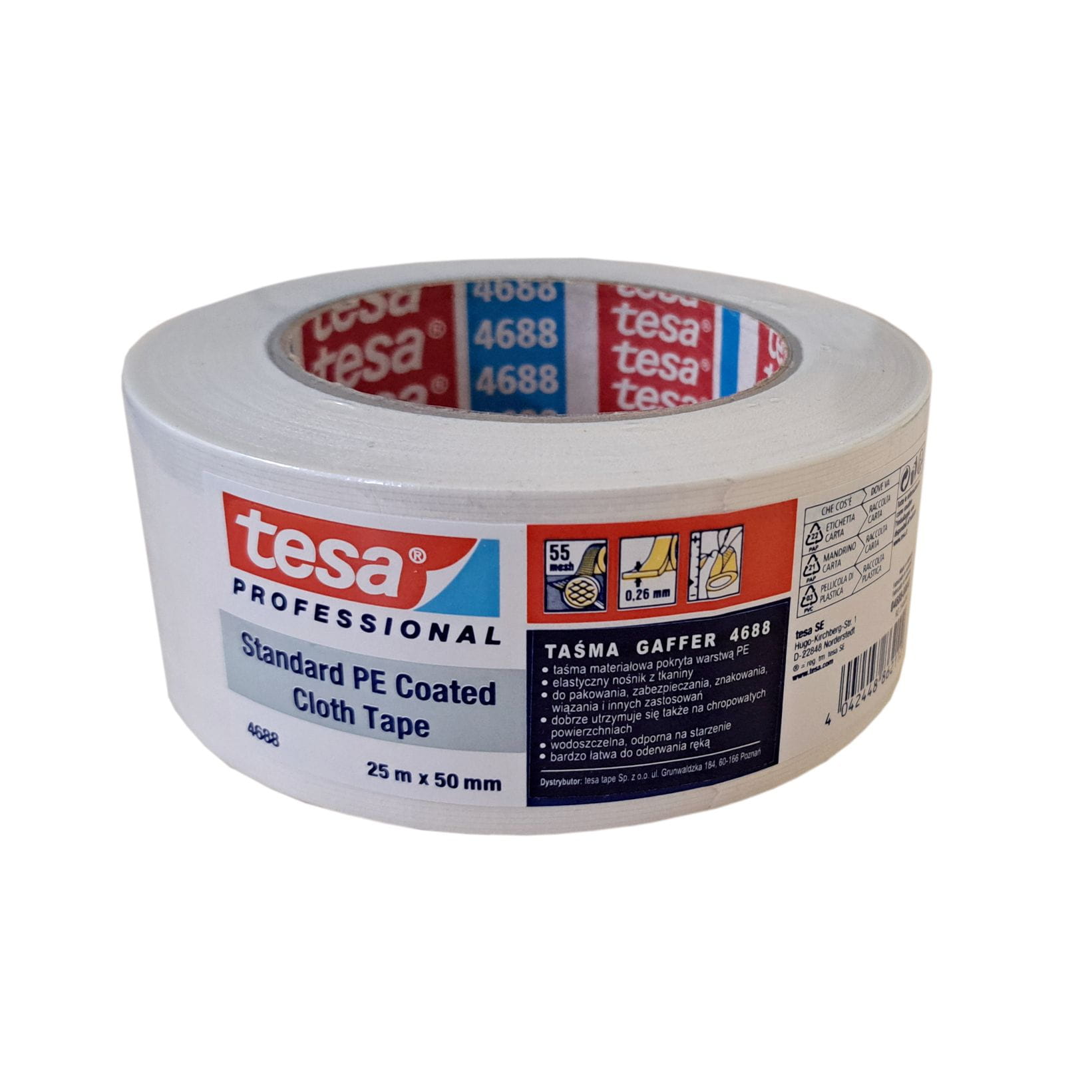 Taśma tkaninowa TESA 4688 posiada nośnik powleczony polietylenem i masę klejącą z kauczuku naturalnego. Kombinacja ta gwarantuje łatwość użytkowania – taśma łatwo się odwija i można ją urywać ręcznie. Taśma naprawcza jest mocna, ale także wystarczająco elastyczna, aby stanowić niezawodne wsparcie przy realizacji prac. Taśma nadaje się do wielu różnych zastosowań i cechuje ją bardzo duża przyczepność nawet do chropowatych powierzchni.